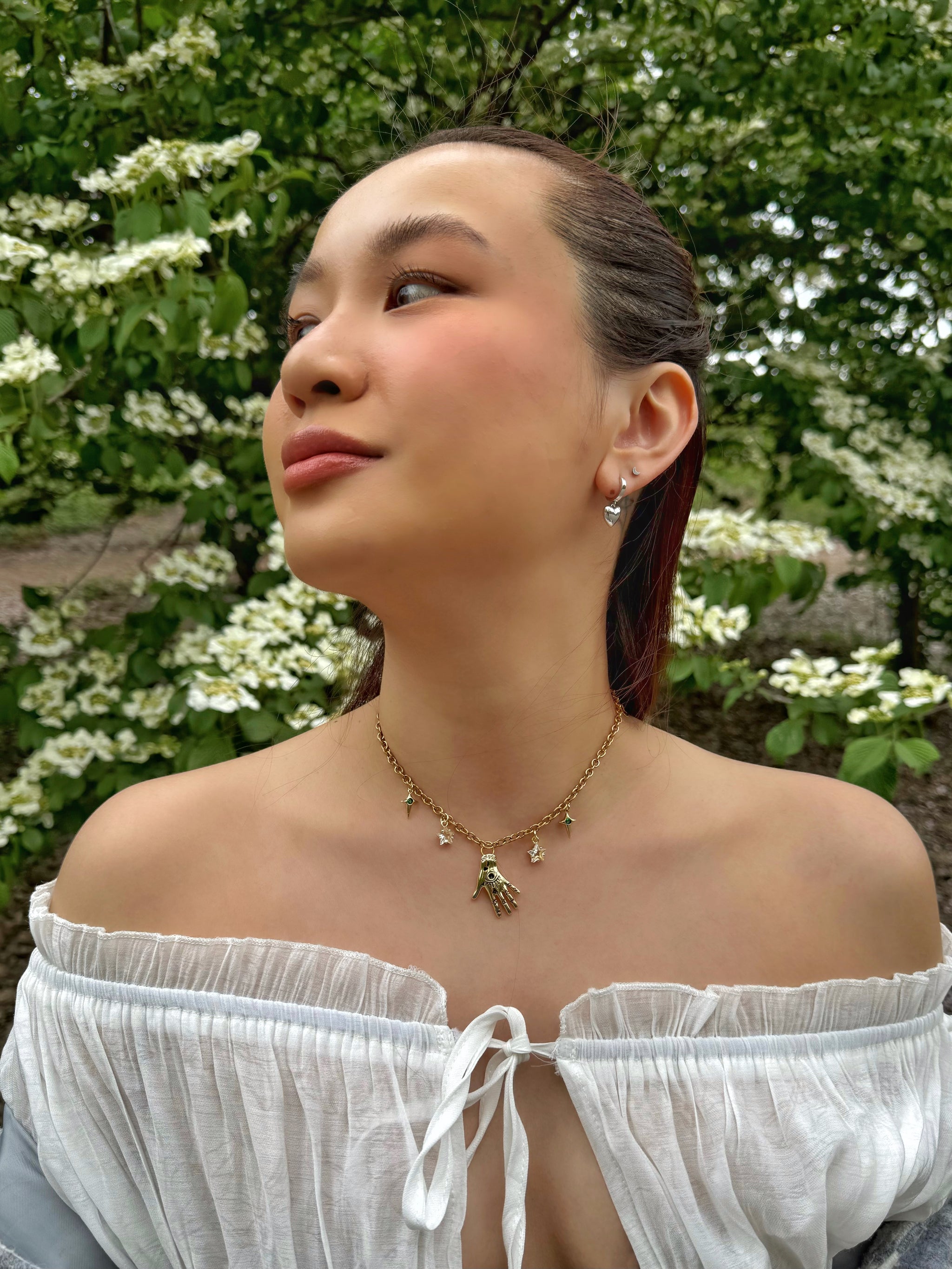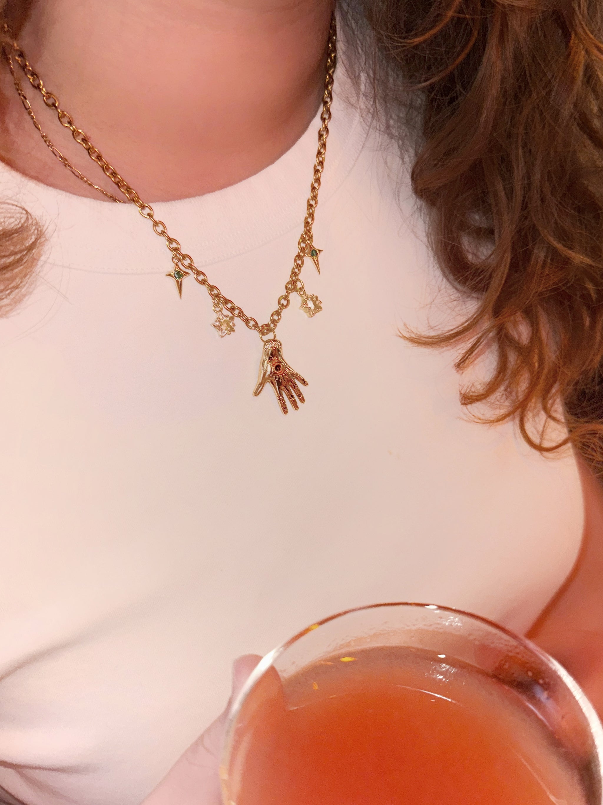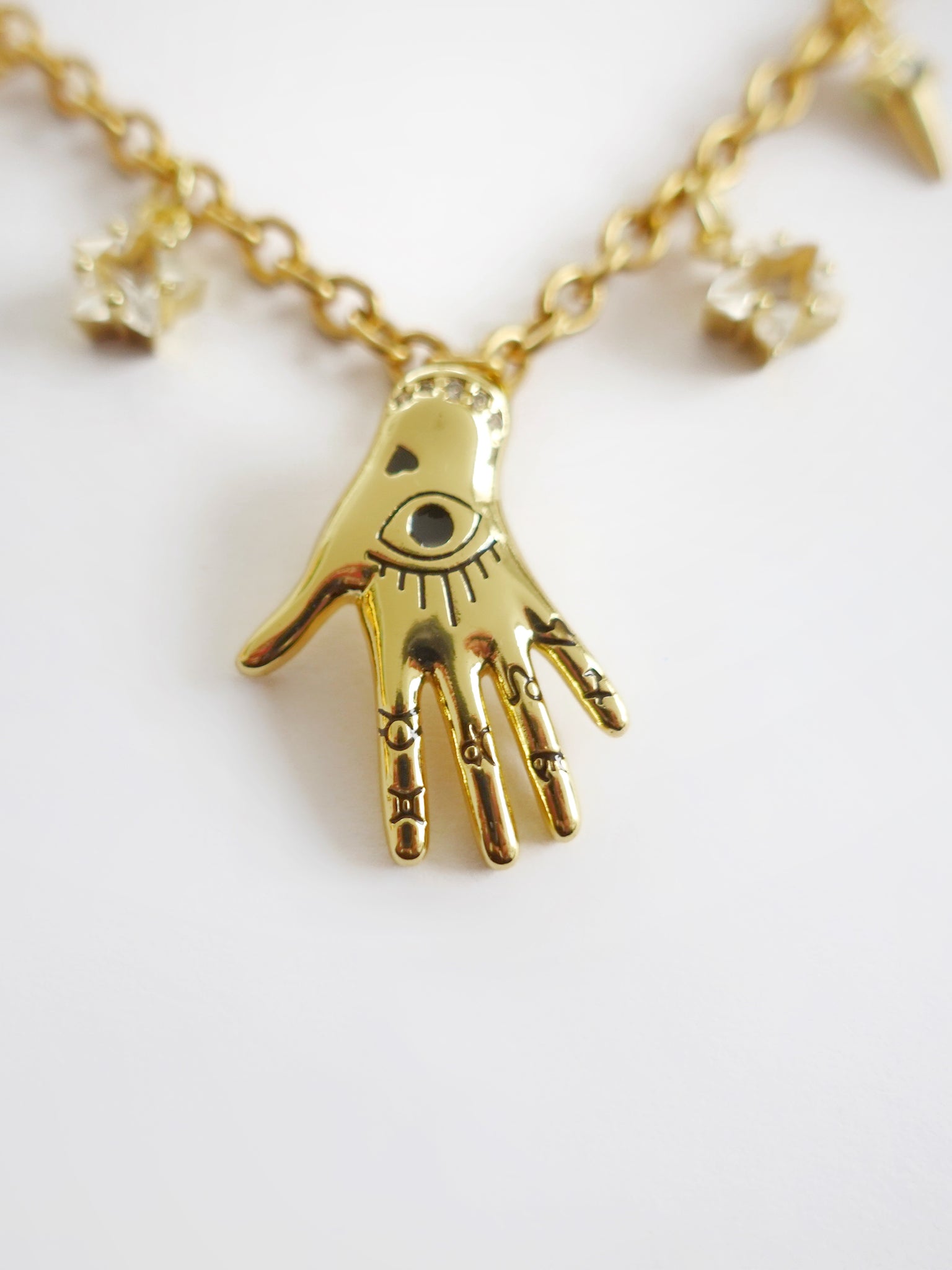 The center charm is the hand of an oracle! inked with an eye, a heart, and mysterious undecipherable symbols. All framed by 2 wishful stars, and then again with two more cryptic looking green stars.